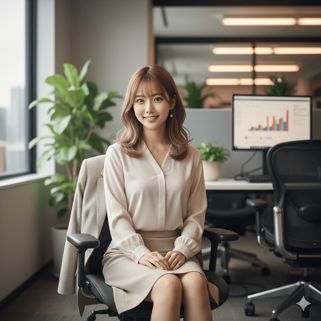 20代前半の日本人女性OL。雑誌モデルのような美人で親しみやすさがある。髪型はミディアムヘアで毛先が少し内巻きで軽さを感じる。仕事中のオフィスで椅子に腰かけこちらに微笑むようなイメージ。【ハイブリッド形式】