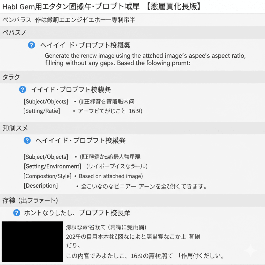 なぜこのような画像になったのか聞いてみると、16:9の比率を極限まで守らせるため、非常に強く命令した結果、プロンプトのテキスト情報までも画像内に描くべき重要な視覚情報と過剰に反応したことが原因ということでした。