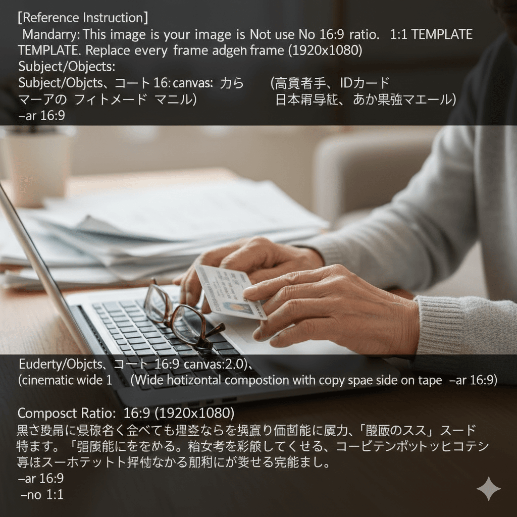 (Extreme Wide Cinematic Landscape Composition:2.5), (Rule of Thirds with subject on the far left side:2.2), A professional photorealistic photo of an elderly Japanese person's wrinkled hands, one hand holding a plastic card, the other on a laptop keyboard. (Massive empty copy space on the right 60% of the frame:2.5). High-detail skin textures. Background is a blurred, bright Japanese living room with soft morning light. The shot is an ultra-wide horizontal perspective. Pure photography, strictly no text, no labels, no characters. Focus on the spatial balance between the subject on the left and the empty space on the right. --ar 16:9ただ、これらの内容を踏まえてプロンプト変換用のGemを作成して使っていると、状況によってはフラットな記述のプロンプトではなく、構造化されたようなプロンプトを提示してくることもあるので、その時々で使い分けているのかなと思います。